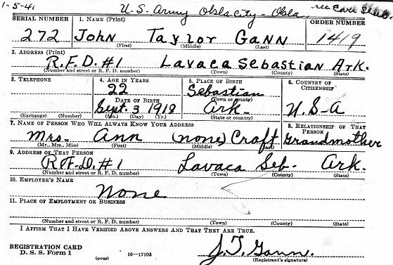 John Taylor Gann was born September 3, 1918 at Huntington, Sebastian Co., Ar. to