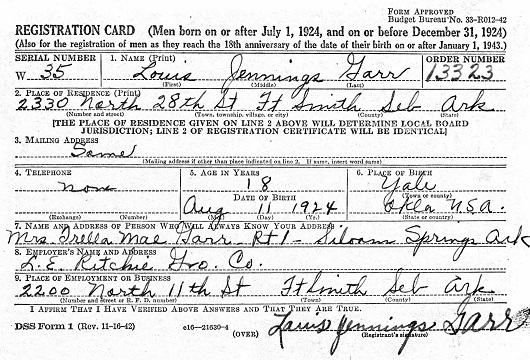 Louis Jennings Garr was born Aug 11, 1924 in Okla. to Clyde Earnest & Trella Mae Stewart