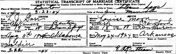 Garr. On 22 Mar 1944 he married Louise Reva Moon in Benton Co., Ar.