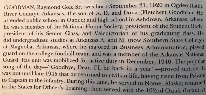 He was predeceased by his mother and father and one son, Wyndal Martin Goodman. R.C. grew up in Ogden and was the Valedictorian of his high school class at Ashdown High School in 1938. He joined the Arkansas National Guard in 1939 and began college at Magnolia A & M in Magnolia, Arkansas.