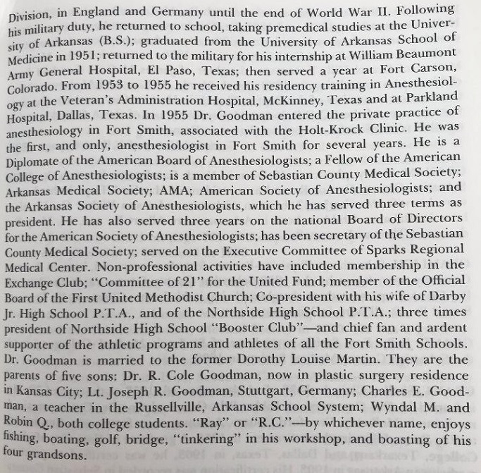 He started and lettered in football for the Mulriders for two seasons in 1939-40. In 1939 he also met the love of his life, Dorothy Louise Martin. In 1940 the Arkansas National Guard was mobilized and R.C., a Sargent, and the rest were sent to Nome, Alaska in early 1941. R.C. returned to the continental United States in 1943 to attend Officer Candidate School. More importantly he and Dorothy married on April 10, 1943. In September 1944 Lieutenant Goodman joined the 102nd Ozarks Division, part of the IXth Army, in Liege, Belgium. He participated in the Rhineland campaign crossing the Meuse River, the Ruhr, Rhine, and finally ended at Stendhal, Germany on the Elbe River. R.C. was commandant of two German towns. R.C. finished the war with the rank of Major and was awarded a number of medals, a few of which are the Combat Infantryman's Badge, two Purple Hearts, and the Bronze Star for Valor. Upon returning home R.C. stayed in the active reserve or National Guard until 1962. R.C. and Dorothy matriculated at the University of Arkansas in Fayetteville. Dorothy graduated in the spring of 1947 and R.C. started Medical School at the U of A in Little Rock in fall 1947, receiving his Bachelor's Degree in spring 1948. In 1951 R.C. graduated with his MD degree. He and Dorothy and three sons were posted in El Paso first and Colorado Spring later. R.C. chose to become an anesthesiologist and had a combined residency at Parkland U Texas Southwestern and the V A Hospital in McKinney, Texas. He was the second anesthesia resident at each program. He became an expert in Regional Anesthesia, Fluid and Electrolyte resuscitation, and a national pioneer in the treatment of chronic pain. R.C. and Dorothy and four sons then came to Fort Smith where R.C. was the first and for several years the only anesthesiologist in the region. He established the R.C. Goodman Institute for the Treatment of Chronic pain at Sparks Hospital. R.C. served Sparks, Mercy, Crawford County Hospitals and the T.B. Sanatorium in Booneville. R.C. was a lifelong Christian and member of the First United Methodist Church for 59 years, and member of Gleaners Sunday School Class, Noon Exchange Club for 50+ years, Community Chest Committee of Friends of the Library, Team physician at Northside High School for 19 seasons. He and other fathers built Skokos and Higgins Fields to begin the Church League Complex. R.C. provided support in many ways to many organizations that are too many to name. R.C. was a kind and gentle man who always put others before himself. He adamantly taught his boys the "Golden Rule". He was the epitome of what a Father and man should be.