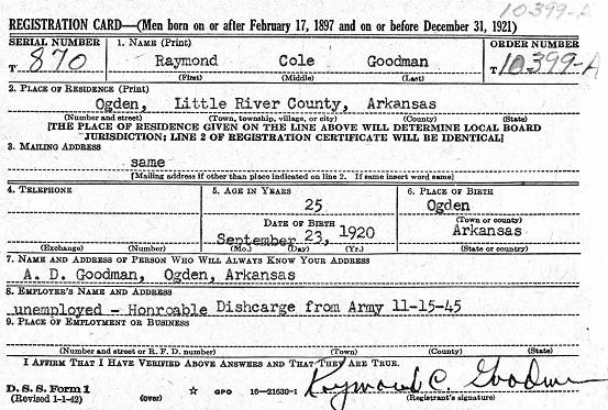 Raymond registered for the military draft on November 23, 1945 in Ashdown, Little