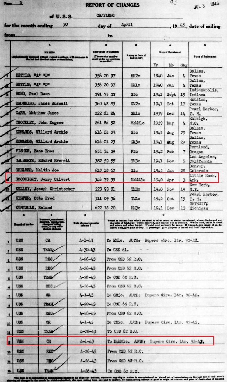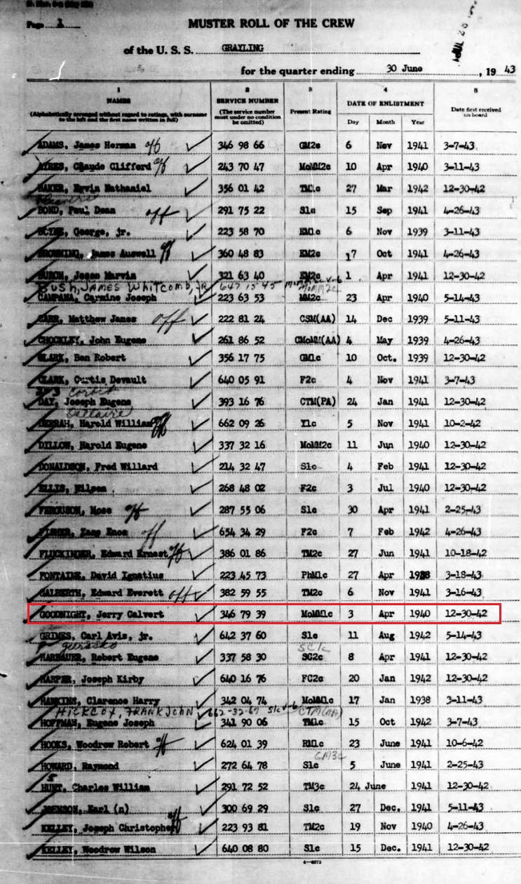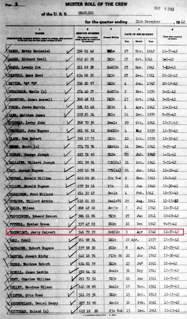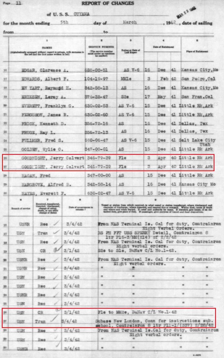 He served as a First Class Specialty, Motor Machinist's Mate Group. He is on the muster roles in