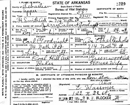 Jerry Calvert Goodnight was born January 24, 1918 in Greenwood, Ar. to Earl Easley "Pickens"