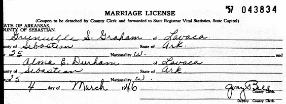 Louisa Manes Graham at Lavaca, Sebastian Co. Arkansas. March 9, 1946 he married