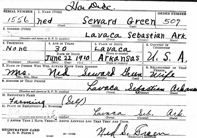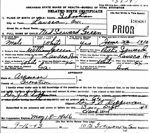 Ned Seward Green was born June 22, 1910 in Lavaca, Sebastian Co., Arkansas to
