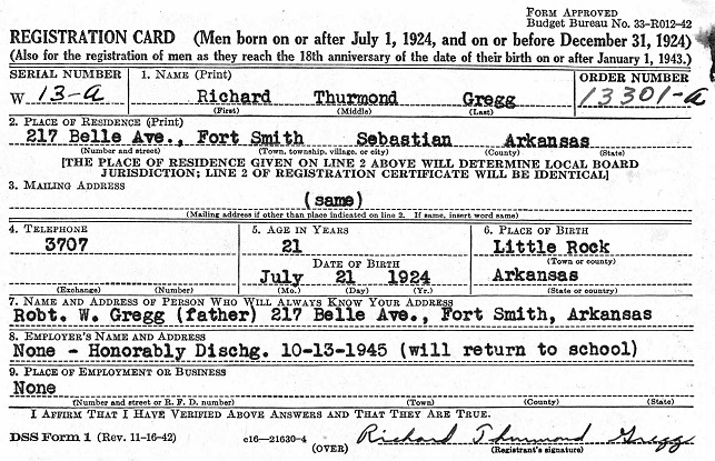 Richard "Dick" Thurman Gregg was born July 21, 1924 in Little Rock, Arkansas to