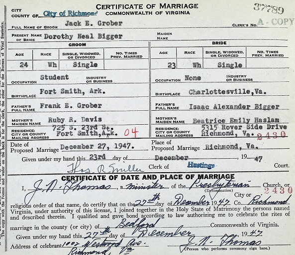 Frank Earnest & Ruby R. Davis Grober. Jack married Dorothy