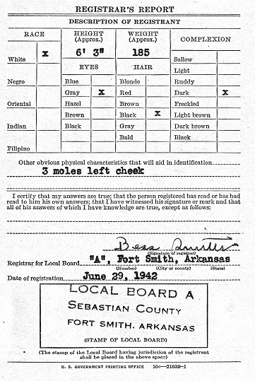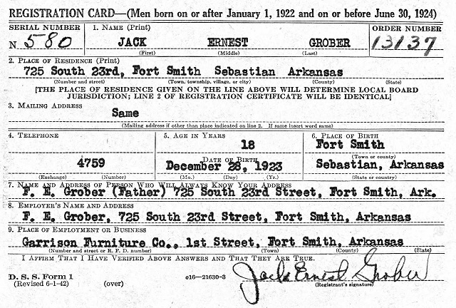Jack registered for the military draft June 29, 1942 at Fort Smith, Ar.