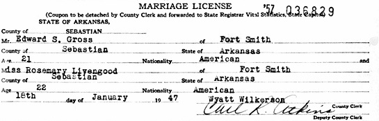 to Rosemary Livengood on Jan 19, 1947 in Fort Smith, Sebastian Co., Ar.