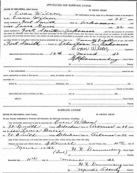 Laura married Evan Towery Wilson March 10, 1932 in Adair, Oklahoma.