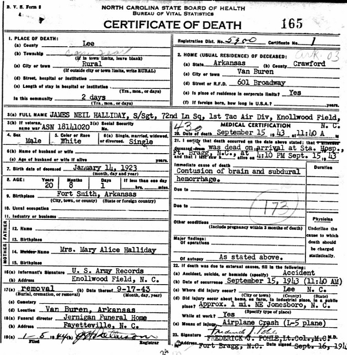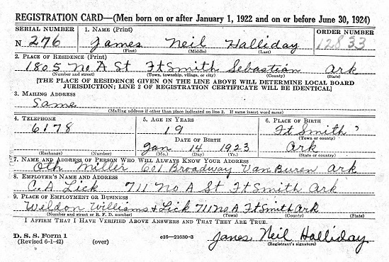 James Neil Halliday was born 14 Jan 1923 in Fort Smith, Sebastian Co., Ar. to