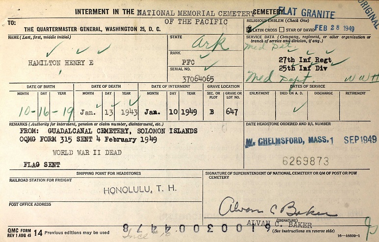 lost his life in battle action 13 Jan 1943 at Guadal Canal. He is buried in the Honolulu, Hawaii,