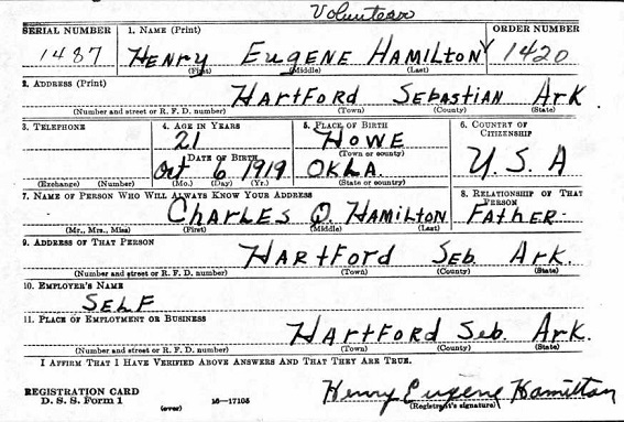 Henry Eugene Hamilton was born in LeFlore Co., Oklahoma 16 Oct 1919. Before 1930 Charley Quincy & Daisy May Padgett Hamilton