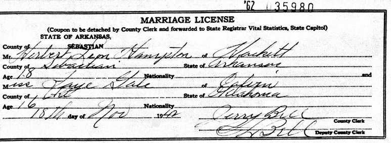 On the 21 of Nov 1942 in Hackett, Herbert married Faye Lavelle Gale of Calvin, Oklahoma.