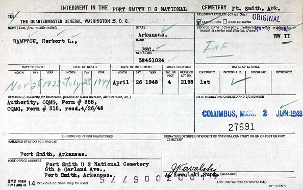 Interment in the National Cemetery at Fort Smith, Ar wasn't