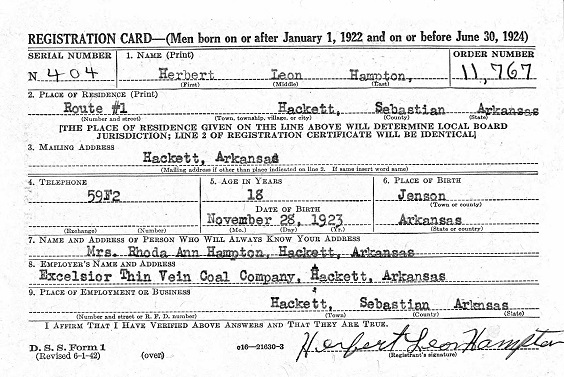 Herbert Leon Hampton was born Nov 28, 1923 at Jenson, Sebastian Co., Ar. to