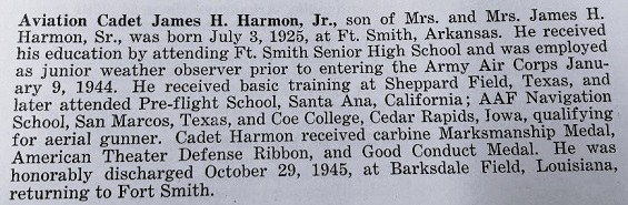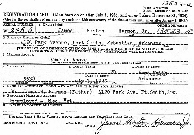 James Hinton Harmon, Jr. was born July 3, 1925 in Fort Smith, Seastian Co. Ar. to