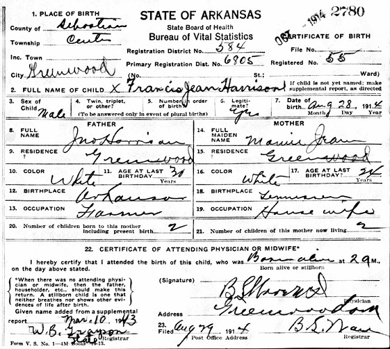 Francis Jean Harrison was born August 28. 1914 in Diamond Twsp, Sebastian Co., Ar. to