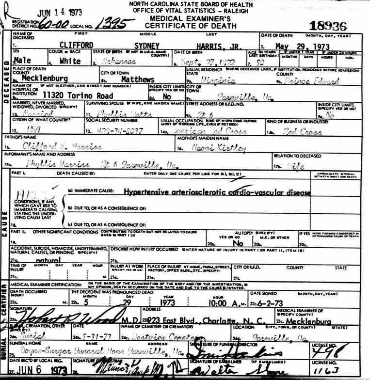 Clifford Sidney Harriss, Jr. passed away May 29, 1973 in