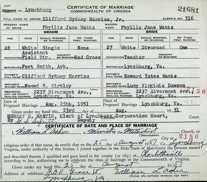 married Phyllis Jane Watts in Lynchburg, Virginia.