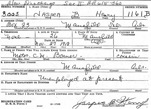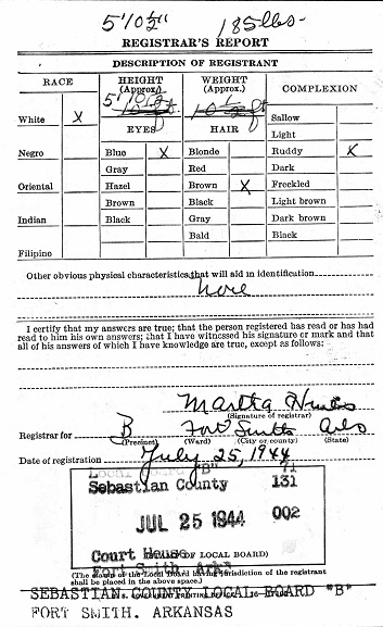 July 25, 1944 Jasper registered for the military draft at Fort Smith, Sebastian