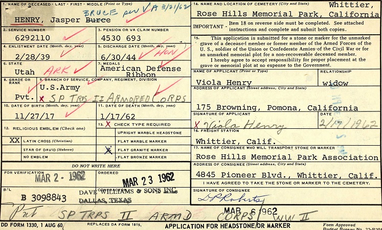 January 17, 1962 Jasper Bruce Henry passed away in Los Angeles, Calif. He was