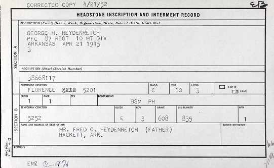 Pfc Heydenreich was killed by hostile fire from the enemy in a battle on April 21, 1945