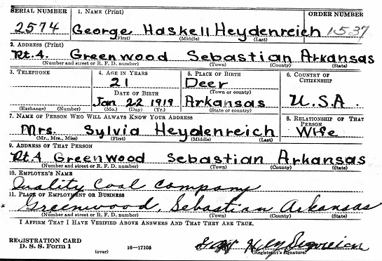 George registered for the military draft October 16, 1940 at Greenwood, Sebastian