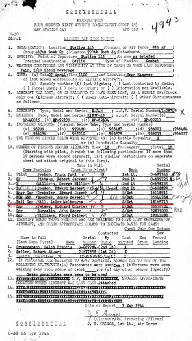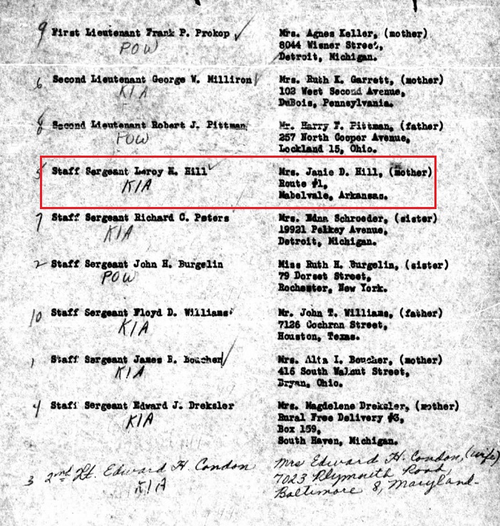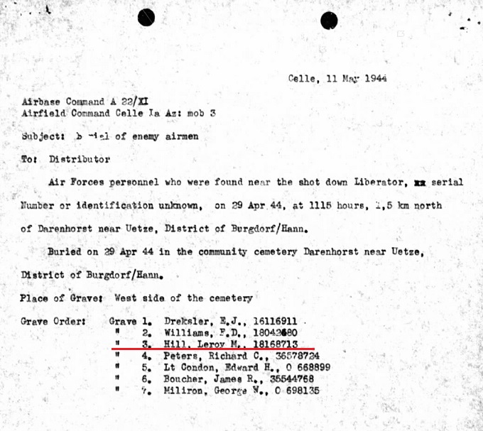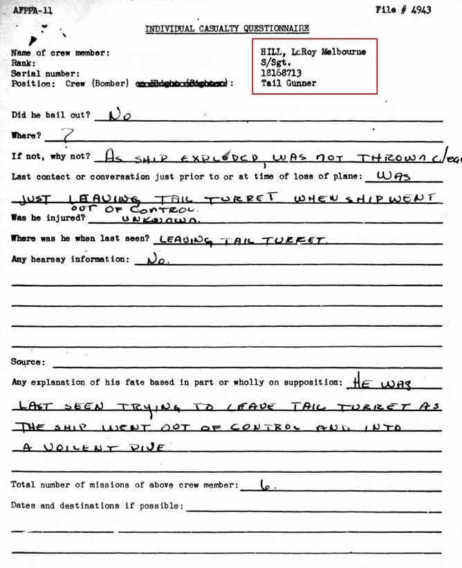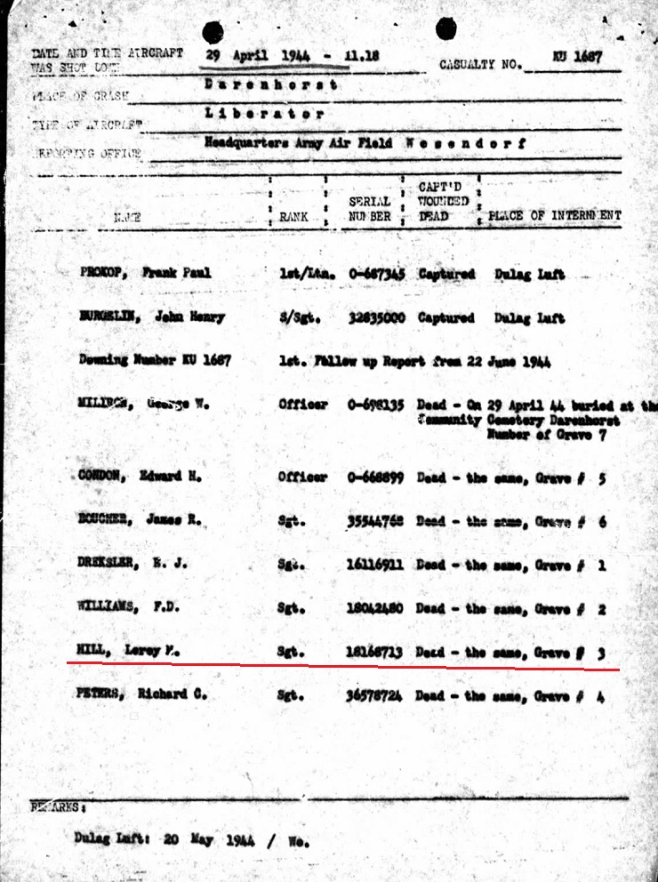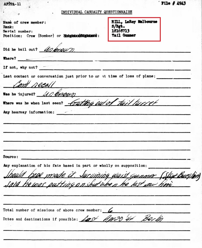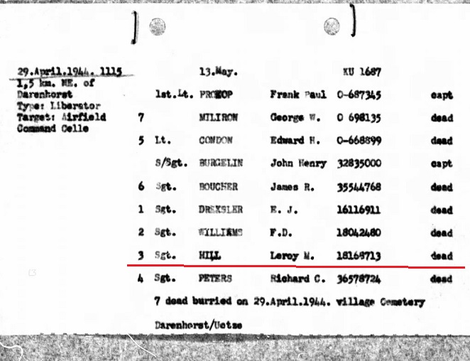 S/Sgt Hill was killed in action 29 Apr 1944. Their destination was Berlin, Germany.