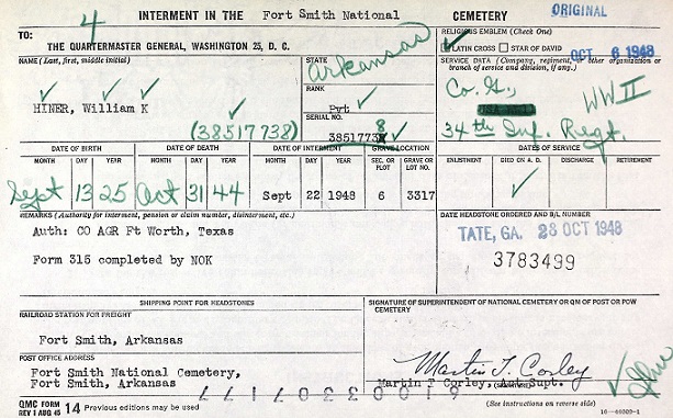 William Kennan Hiner enlisted on the 14 Oct 1943 in Little Rock, Arkansas.