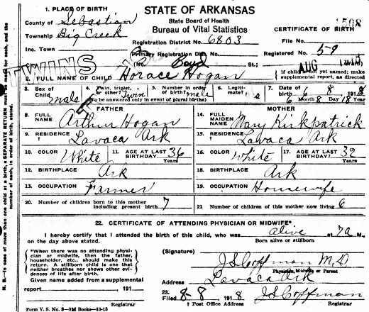 Horace Boyd Hogan was born June 7, 1918 in Lavaca, Sebastian Co., Ar. to