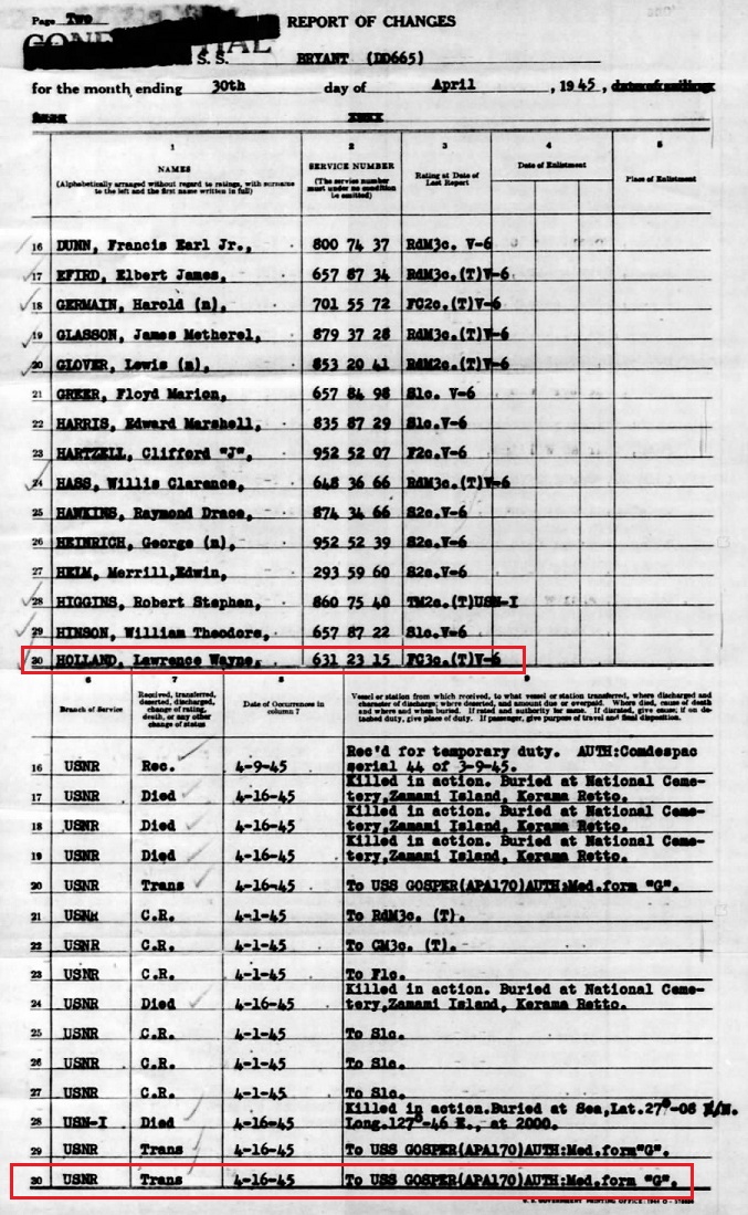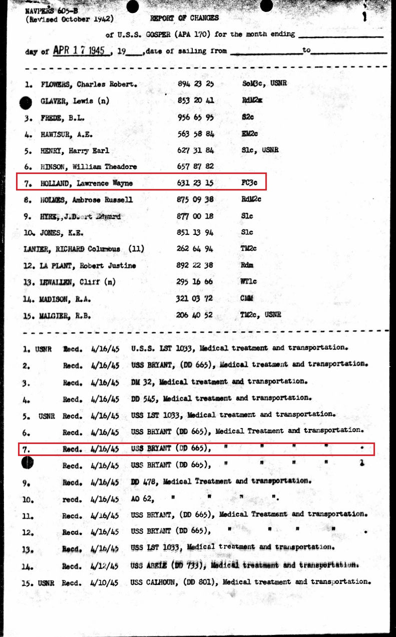 wounded at the Naval Hospital 24 April. Notice that F3c Holland was "Recd. 4/16/45 for