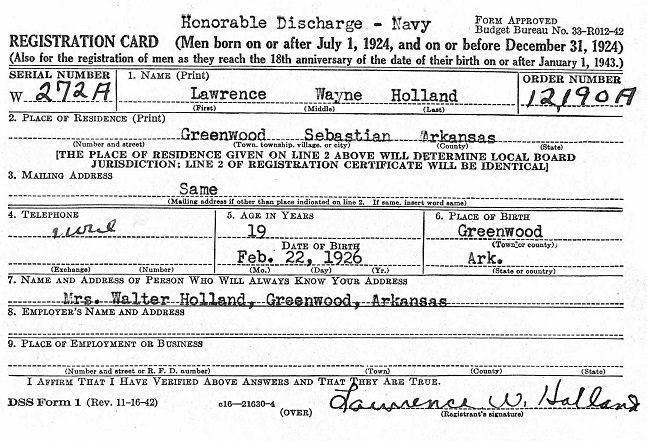 Lawrence Wayne Holland was born February 22, 1926 in Greenwood, Sebastian Co., Ar.