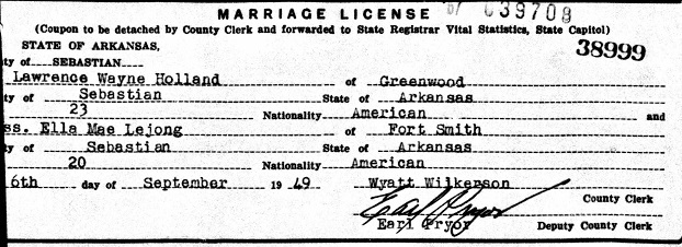 married Ella Mae LeJong from Fort Smith, Sebastian Co., Ar.