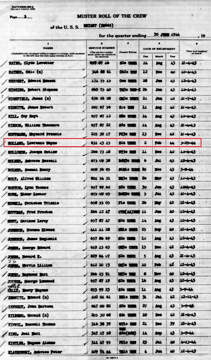 Quarter ending June 30, 1944 the USS Bryant's muster records shows