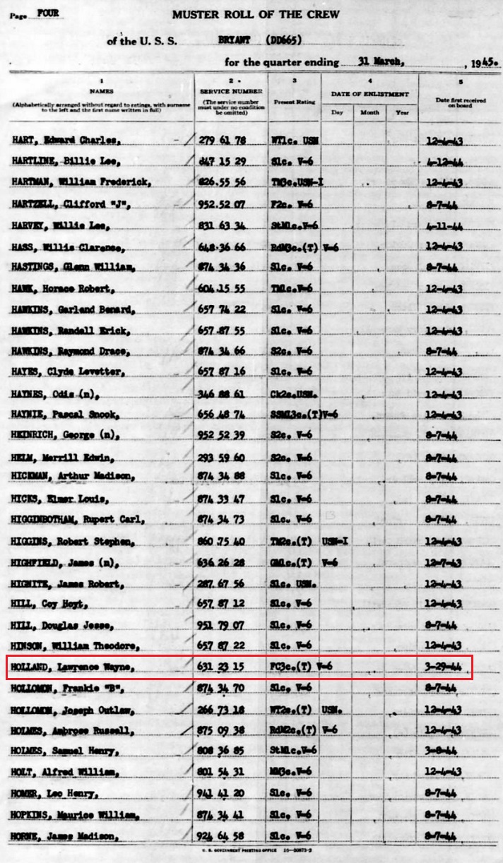 In the month of April 1945 Wayne is on the muster of the USS Bryant.