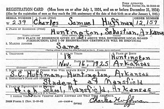 Charles Samuel Huffma was born 20 Nov 1925 in Sebastian County, Arkansas to
