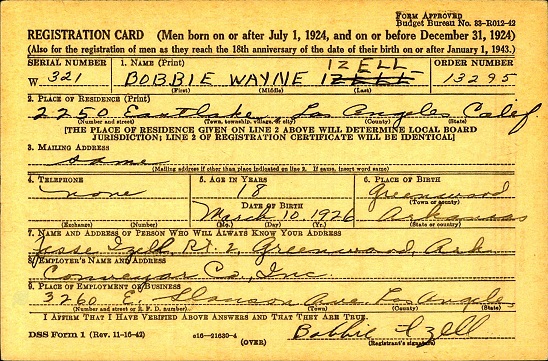 Bobbye Wayne Izell was born March 10, 1926 at Excelsior, Sebastian Co., Ar. to