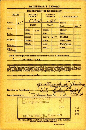 March 10, 1944 he registered for the military draft in Los Angeles Co., California. In 1944