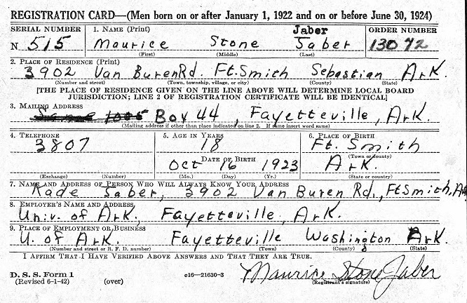 Maurice Stone "Buddy" Jaber was born October 16, 1923 in Fort Smith, Sebastian Co., Ar. to