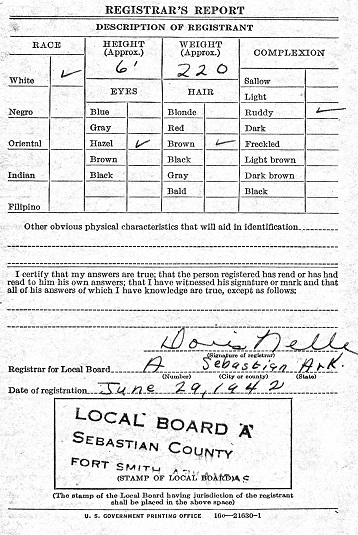 Buddy registered for the military draft June 20, 1942 in Fort Smith, Sebastian Co., Ar. He