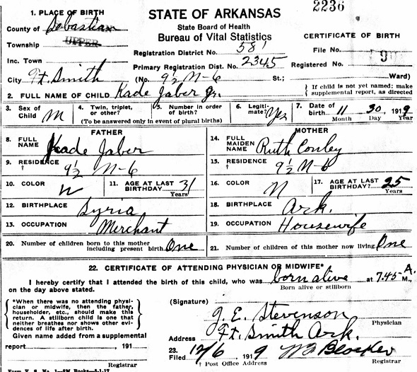 Kade Kassem Jaber, Jr. was born November 30, 1919 in Fort Smith, Sebastian Co., Ar. to