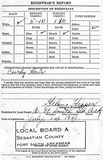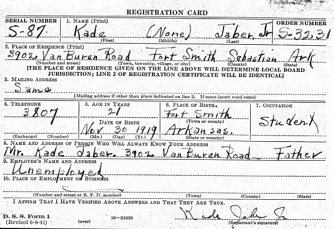 July 1, 1941 Kade registered for the military draft at Fort Smith, Sebastian