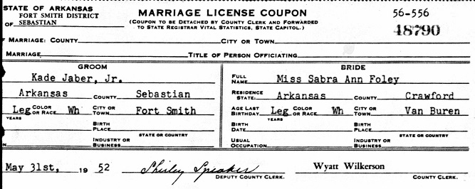 Kade Kassem Sr. & Ruth H. Conley Jaber. May 31, 1952 he married