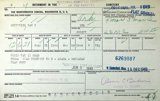 Cpl. Jefferies died at Guam 21 July 1944.