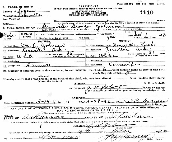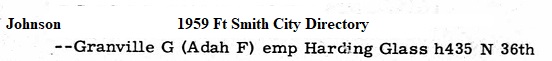 Granville George Johnson passed away April 7, 1987 at Fort Smith, Sebastian Co., Ar.