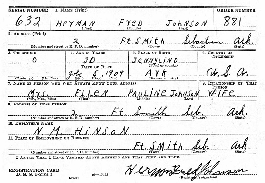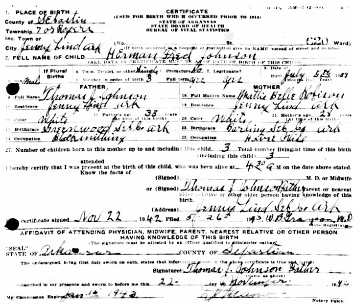 Herman Fred Johnson was born July 5, 1919 in Jenny Lind, Sebastian Co., Ar. to