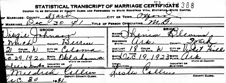 Dec 30, 1941 while living in Caloma, Berrin, Michigan Virgil married Phenia Blevins