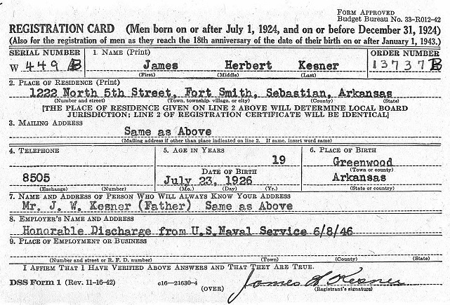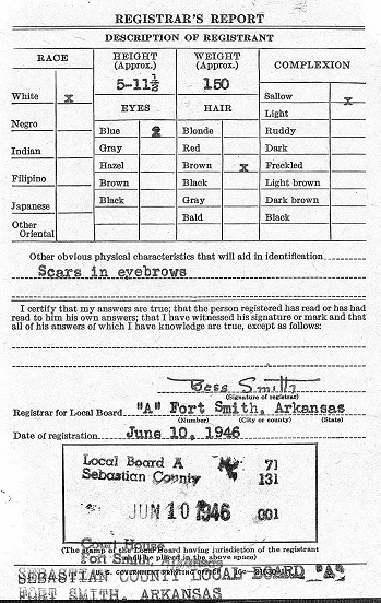 James registered for the military draft June 10, 1946 at Fort Smith, Arkansas.